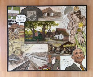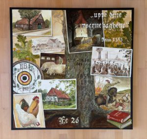 Am ersten Sonntag in der Saison, am 03.05.2026 eröffnet der Künstler Andreas Pohl aus Isernhagen seine Ausstellung „Die alten Dörfer Isernhagens“. Hierbei ist besonders ein vierteiliges Bild auf der Diele bemerkenswert. Es zeigt eine Reise durch die letzten gut 1200 Jahre- von Karl dem Großen bis Barack Obama, von den Hopfenfahrern bis zur Bluesgarage.
